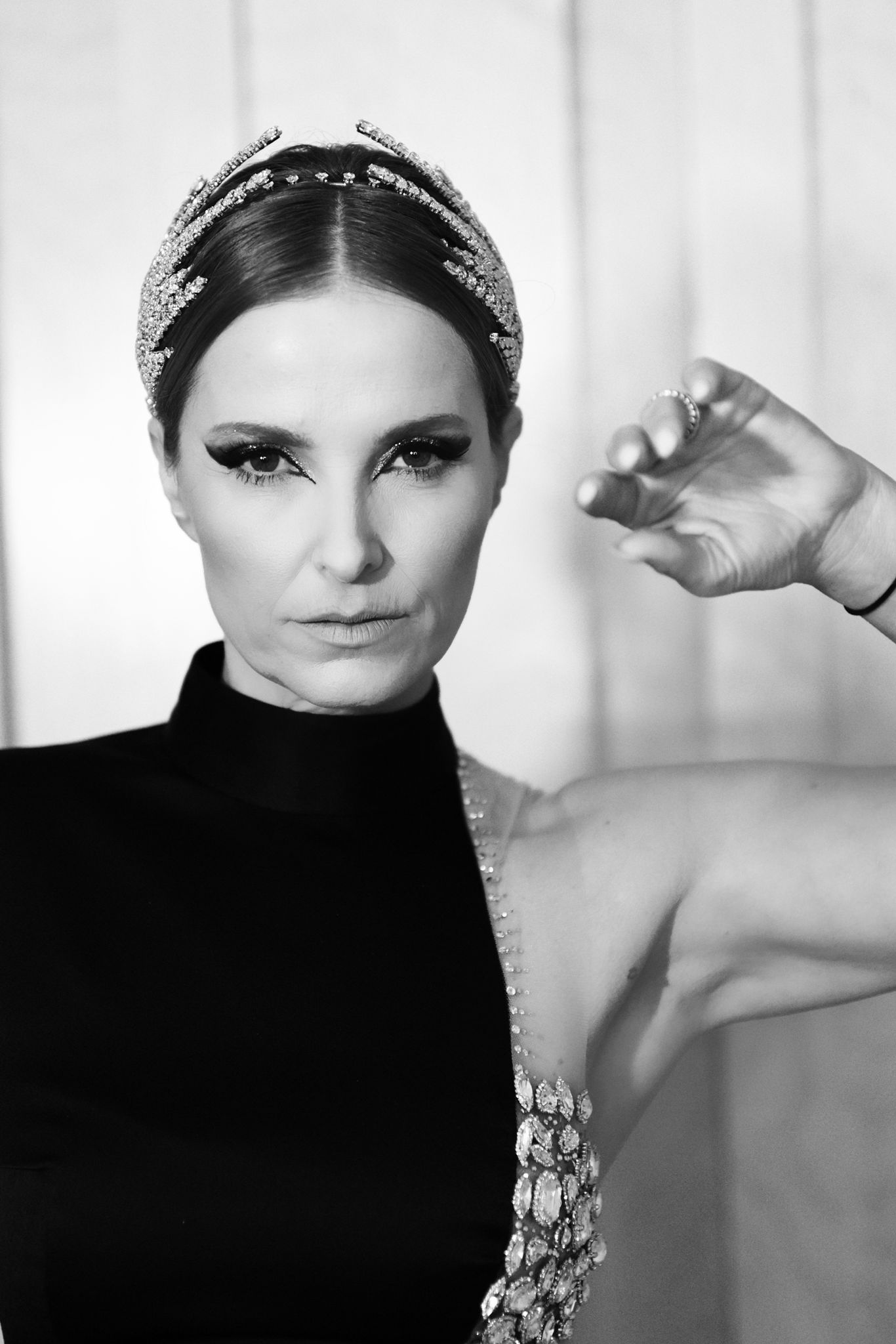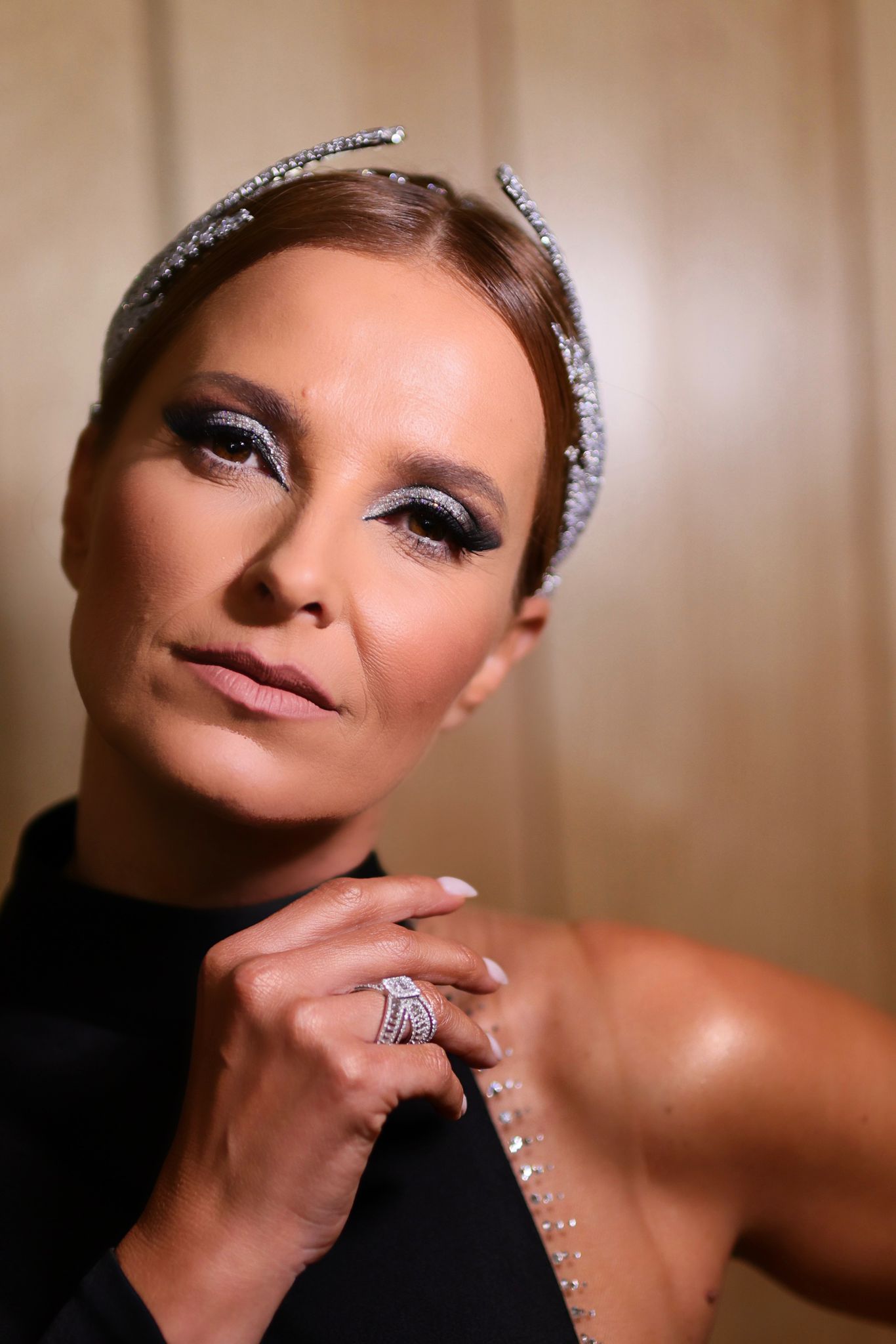 Na cabeça uma autêntica jóia da coroa – uma Head Piece com mais de 300 cristais swarovski, colocados em formato de palma nas laterais que enalteceram toda a beleza da apresentadora, num penteado em coq-chignon.