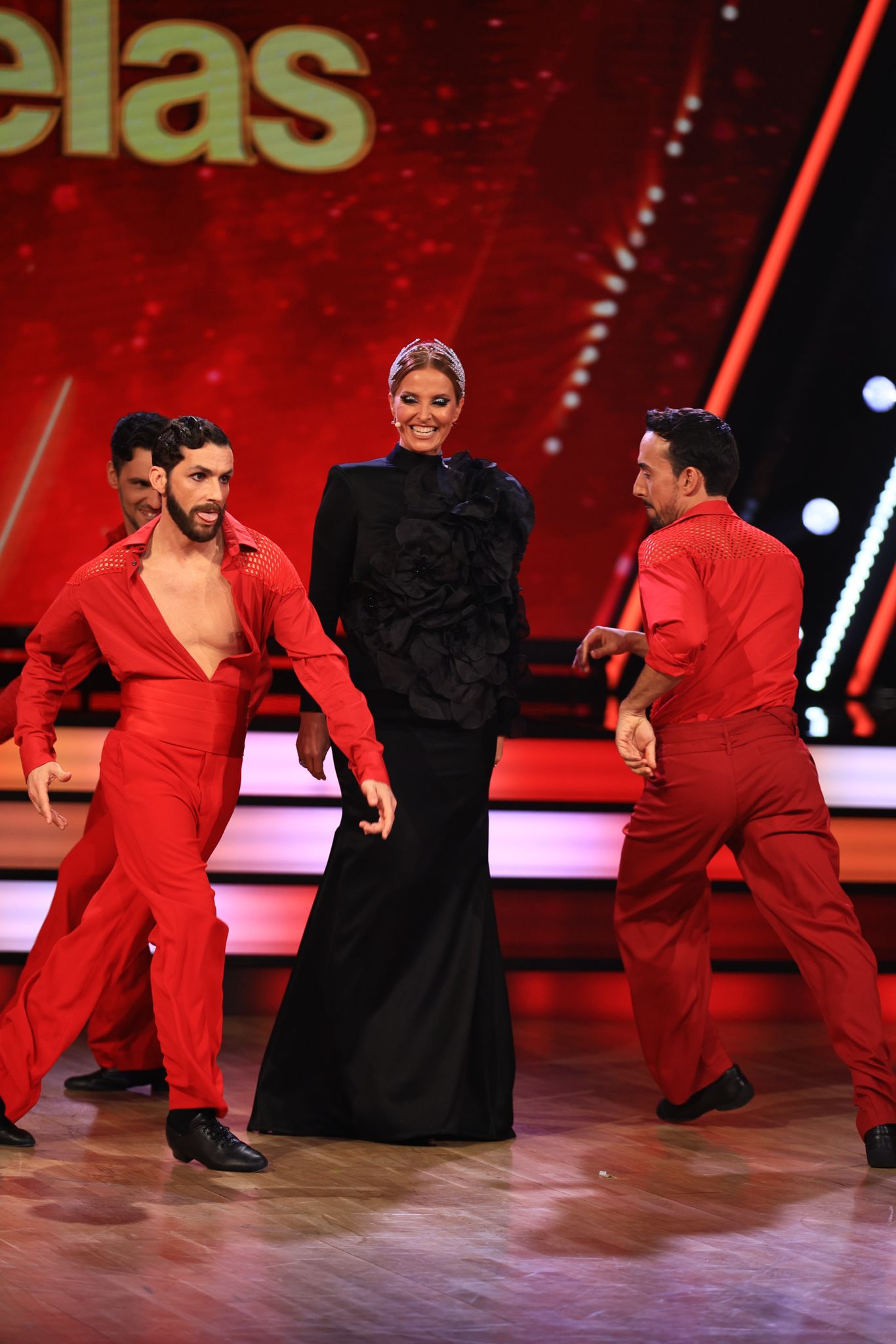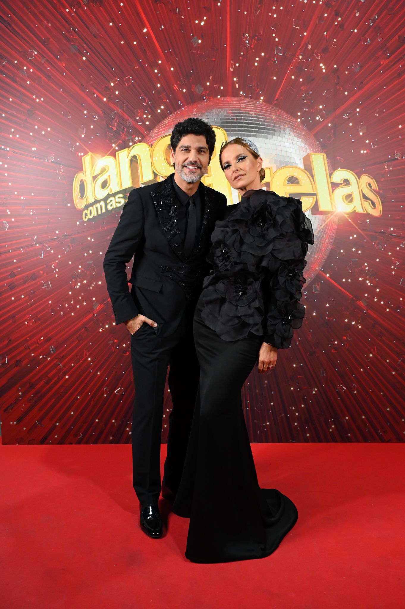 No início do programa, Cristina Ferreira surgiu com um vestido longo preto em sablé de seda, adornado na parte superior com uma dezena de flores em chiffon de seda preta, feitas à mão e aplicadas uma por uma.
