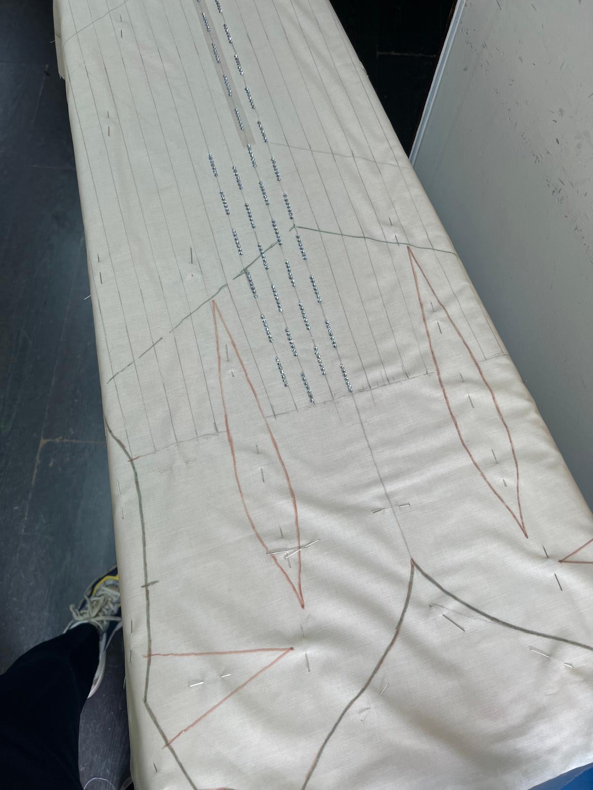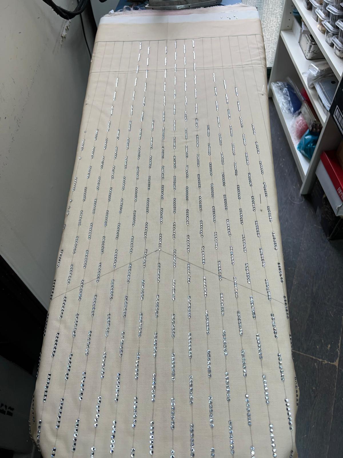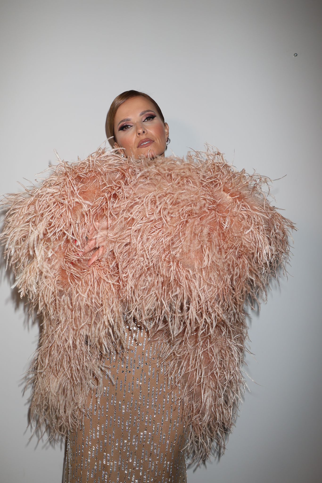 Ao entrar em cena, Cristina flutuou com uma capa de 24 metros de plumas de avestruz num tom nude, que conferiu ao vestido ainda mais destaque. Os 75 mil cristais aplicados manualmente e um a um ganharam vida e justificaram os 21 dias de trabalho dedicados a este vestido. Uma técnica desenvolvida no atelier do João Rôlo Couture, que passa por aplicar manualmente cada cristal inicialmente no tule e só depois dar forma a esse tecido para que se torne num vestido .Um trabalho de precisão, muita técnica que resulta neste visual altamente simétrico, preciso e de uma beleza ímpar.