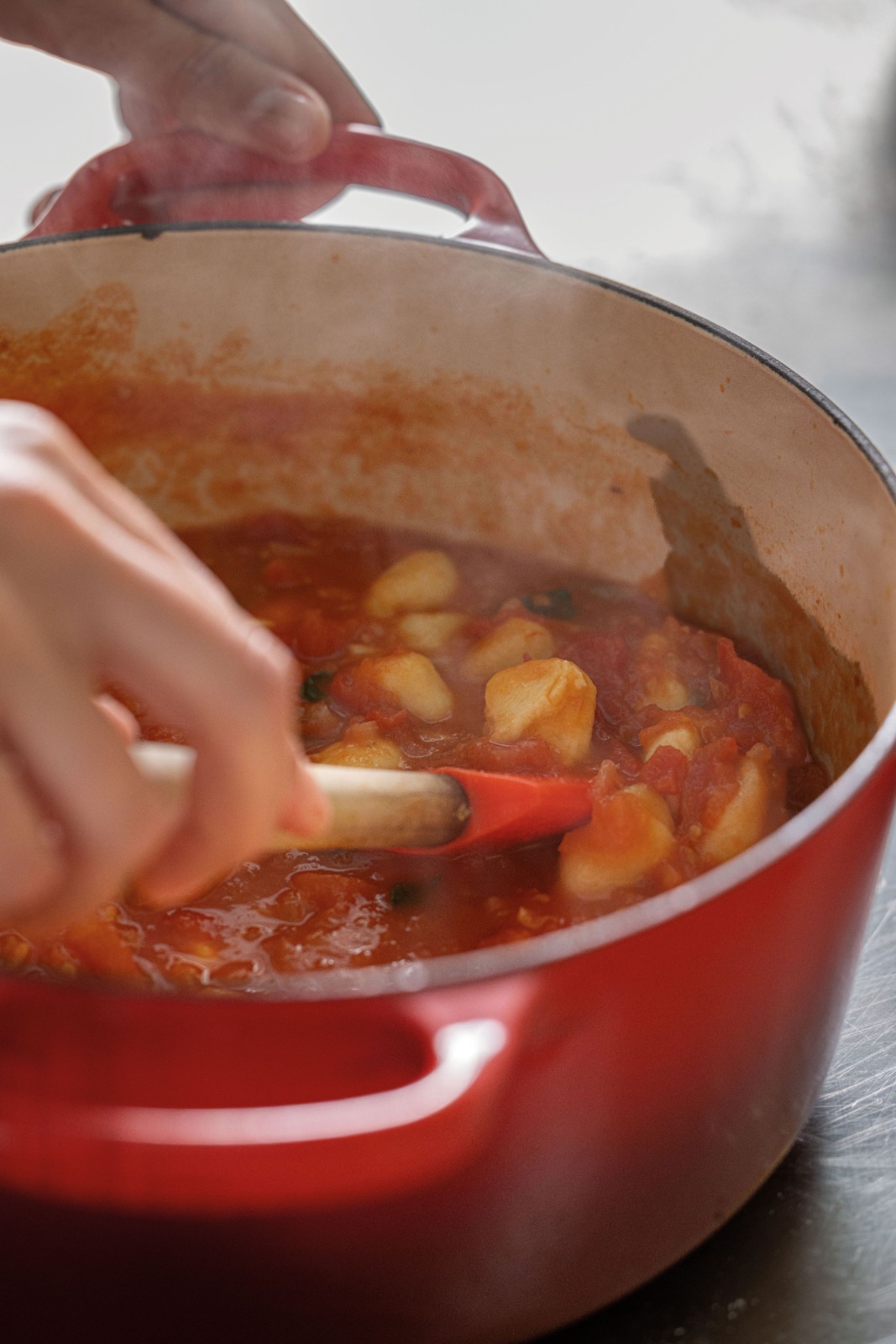 Nota: Pode aproveitar alguma da água da cozedura dos gnocchi, para trabalhar a textura do molho de tomate.